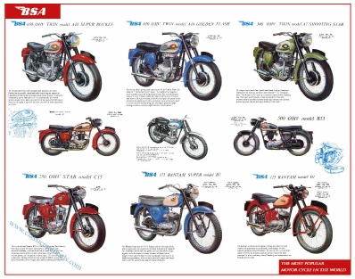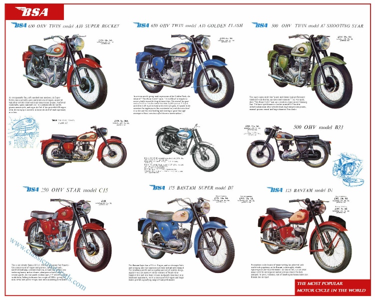 I’ve always been a BSA fan since my first secondhand BSA pushbike ( not to mention the 1949 BSA M20 and sidecar that came in later years!) This poster is taken from my original 1960 Brochure. From the 175cc Bantams D1 and D7 to the 650cc Super Rocket and Golden Flash. Every one a classic! Measures 75 x 61cm. It is printed on professional wide format Epson machinery in archival ink on high quality 230gsm Photo Matte paper £10.95 + p&p Click here to buy