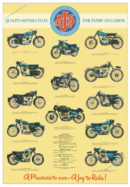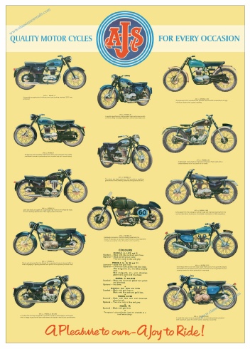 This poster is reproduced from an original brochure for the 1960 AJS range. Covering models from the AJS 250cc Model 14, 350cc Model 8, 500cc Model 18, 500cc Model 20, and the 350cc AJS 7R as well as competition variants. The poster measures approx 55cm x 75cm and is printed on top quality archival 230gsm matte paper. Lightfast and ideal for framing. £10.95 + p&p. Click here to buy