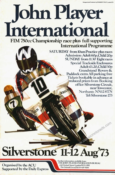 Produced for the 1973 John Player International FIM 750cc race series. This round at Silverstone Race Circuit in the UK. Image shows Peter Williams on the John Player Norton.The poster measures 50cm x 76cm plus white border and is printed on top quality archival 230gsm matte paper Lightfast and ideal for framing £10.95 + p&p Click here to buy