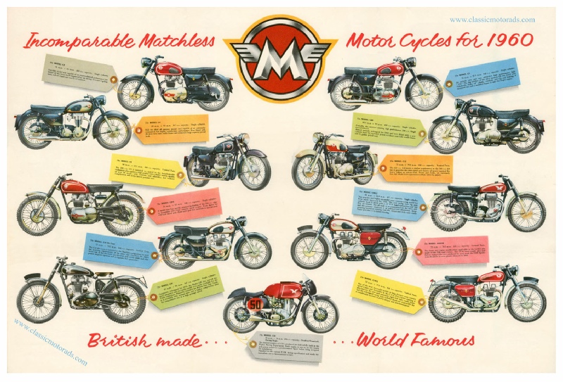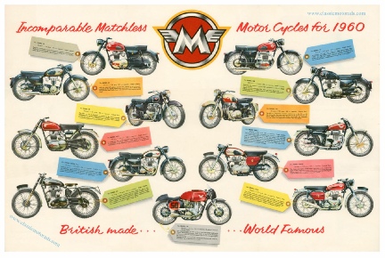 High quality poster reproduced from the original 1960 Matchless range brocure in my collection. Matchless model's shown are G2, G3, G9, C2CS, G12, G3C, G50, G5, G80, G12, G80CS, G12CSR, G12CS. The poster measures 73 x 49cm with a 2cm white border all round. It is printed on professional wide format Epson machinery in archival ink on high quality 230gsm Photo Matte paper £10.95 + p&p